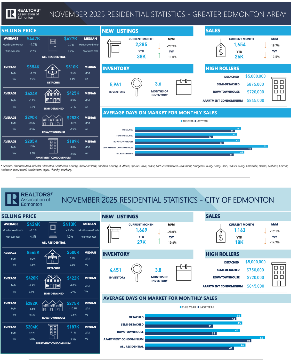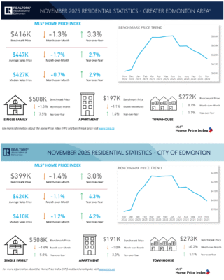 “Last month’s market shift was significant, but well within seasonal expectations. This time of year typically brings fewer sales and more days on market, and it’s not unusual to see softening prices during the colder months, as motivated sellers try to close a deal before year-end. Usually though, it’s a time of year where different priorities are taking precedence over house-hunting, and it’s a great time to start planning for the 2026 market.” –Darlene Reid, 2025 Board Chair, REALTORS® Association of Edmonton