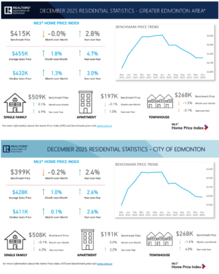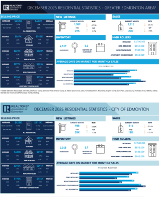 “It’s not unusual for market activity to drop sharply at the end of the year as the holiday season takes hold, nor is it unusual to see price negotiations favour buyers at this time of year. However, detached homes and row/townhouses performed particularly well during the final month of 2025, posting price growth of 2.3% and 2.6% respectively. By comparison, condo/apartment prices declined 5.7% month-over-month and were the only property type to record a decrease compared to 2024.”” –Darlene Reid, 2025 Board Chair, REALTORS® Association of Edmonton