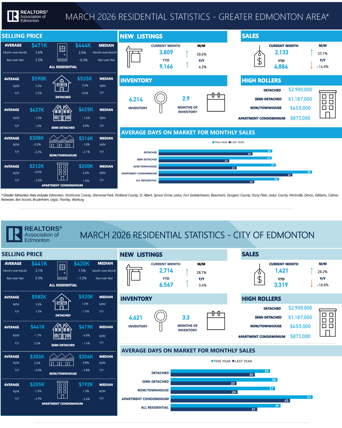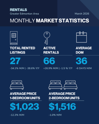 Edmonton, AB – April 1, 2026 — The Greater Edmonton Area (GEA) real estate market reported 2,133 sales in March 2026, increasing 33.1% in comparison to activity in February 2026 and decreasing 14.0% compared to March 2025. There were 3,809 new listings — a month-over-month increase of 30.6% and a year-over-year increase of 4.2%. Inventory levels rose 13.8% from the previous month and are 31.6% higher than March 2025.