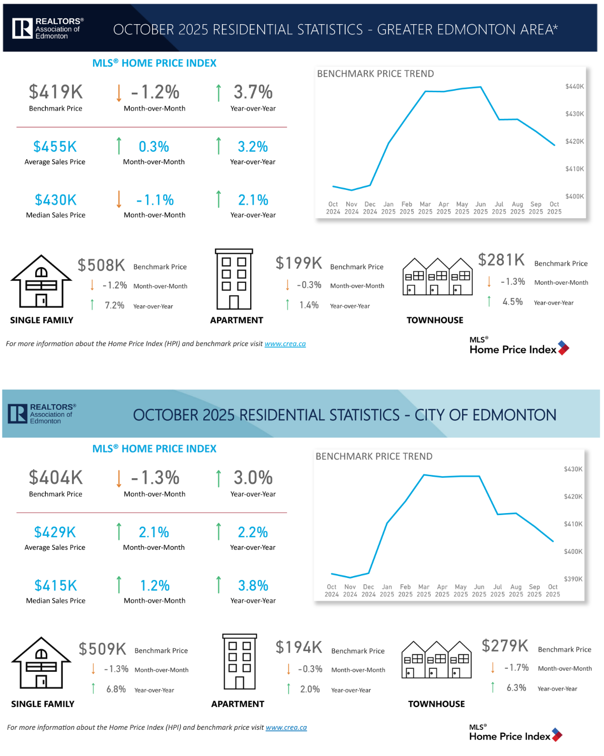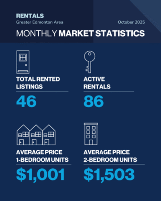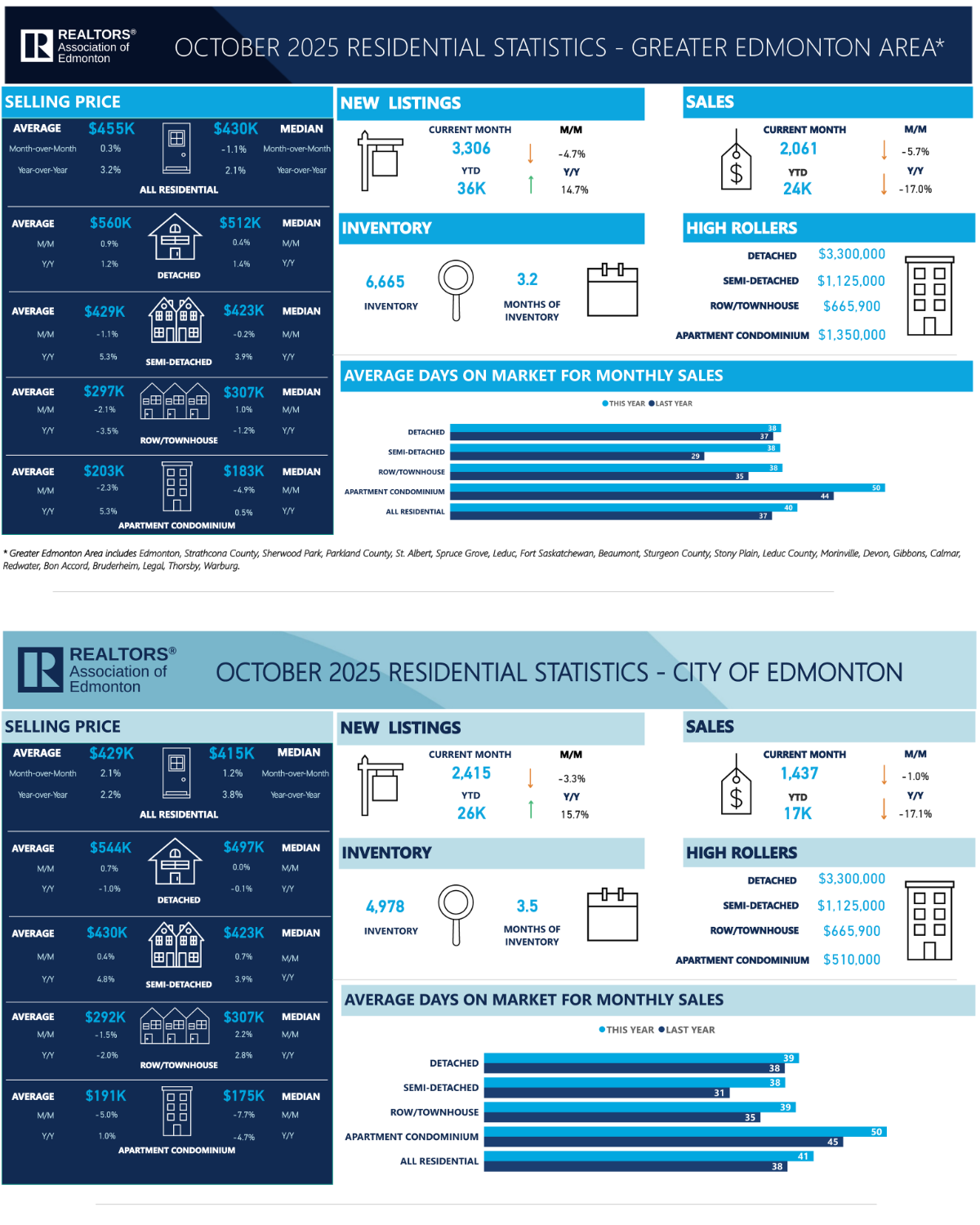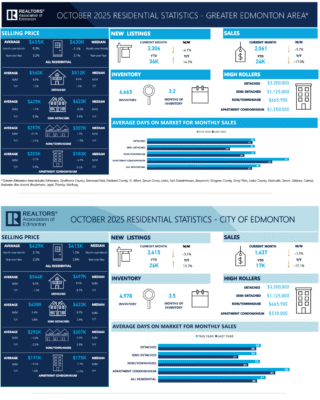 “October’s numbers suggest a natural seasonal slowdown. While month-over-month activity has slowed, sales and prices remain notably higher than this time last year, signalling a market that continues to show healthy demand and stability. After a period of tighter supply, the increase in available listings compared to last year is creating more balanced conditions for everyone in the market — more choice for buyers and steady opportunity for sellers.” –Darlene Reid, 2025 Board Chair, REALTORS® Association of Edmonton